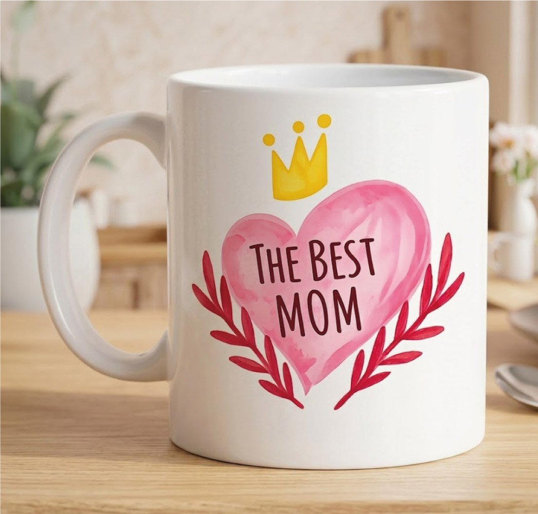 Κάθε μητέρα αξίζει να νιώθει σαν βασίλισσα – ειδικά με το πρώτο φλιτζάνι καφέ ή τσάι το πρωί. Η υψηλής ποιότητας λευκή κεραμική κούπα μας (11 oz) με το γοητευτικό μοτίβο “The Best Mom“ συνδυάζει τη θαλπωρή με τον μοντέρνο σχεδιασμό. Ο συνδυασμός της τρυφερής καρδιάς σε στυλ ακουαρέλας, του χρυσού στέμματος και των κομψών κλαδιών καθιστά αυτή την κούπα το επίκεντρο κάθε πρωινού τραπεζιού.
