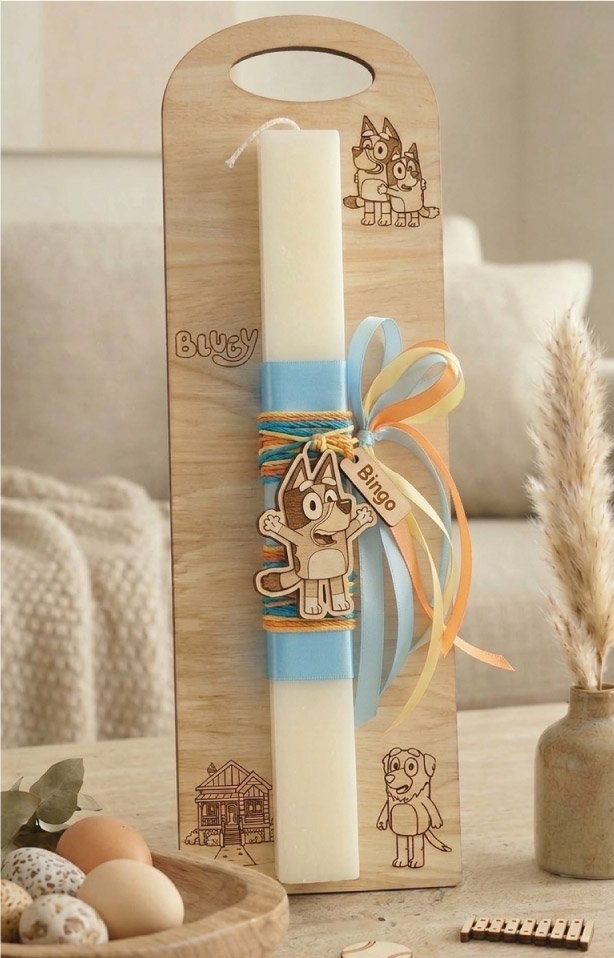 Φέρτε τις περιπέτειες της Bluey στο Πάσχα! Η χειροποίητη λαμπάδα μας, δεμένη σε μια ειδικά χαραγμένη ξύλινη πλάτη, είναι το ιδανικό δώρο για τους μικρούς θαυμαστές.