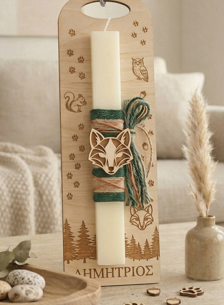 Σχεδιασμός Εμπνευσμένος από τη Φύση: Χειροποίητη λαμπάδα (30 εκ.) με θέμα το δάσος και διακοσμητικό ξύλινο κεφάλι αλεπούς.