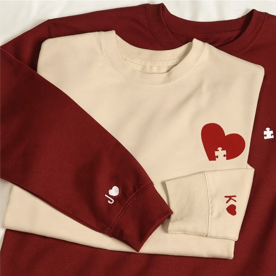 Το τέλειο ταίριασμα! Το σετ με τα δύο φούτερ με εσωτερική επένδυση είναι η απόλυτη δήλωση της σύνδεσής σας. Με το ρομαντικό σχέδιο πάζλ στην πλευρά της καρδιάς και τα δικά σας αρχικά γράμματα στα μανίκια, φοράτε την αγάπη σας παντού.