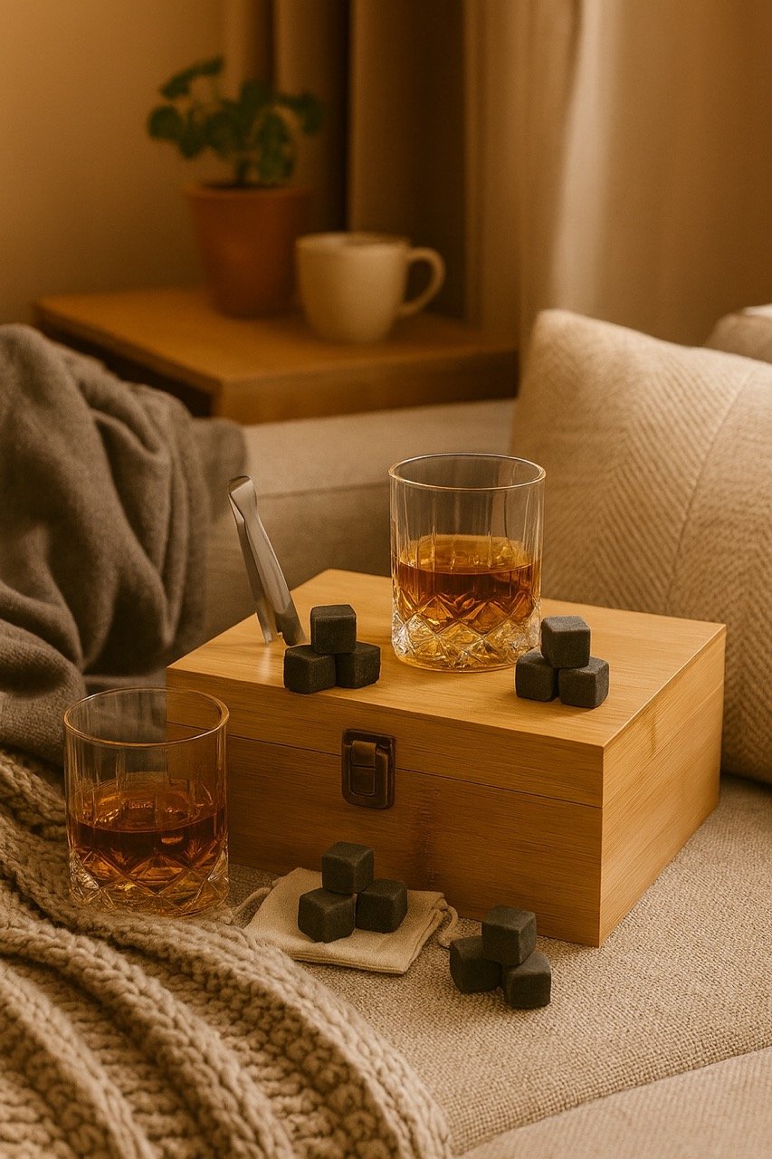 Ανακαλύψτε το Premium Σετ Whisky σε κομψή ξύλινη θήκη από φυσικό μπαμπού, με εσωτερικό die‑cut για ασφαλή τοποθέτηση. Το σετ περιλαμβάνει 2 ποτήρια 320ml, 8 επαναχρησιμοποιούμενους κύβους από φυσική πέτρα στεατίτη (soapstone), ανοξείδωτη λαβίδα και βαμβακερό πουγκί για αποθήκευση. Οι πέτρινοι κύβοι διατηρούν το ποτό δροσερό χωρίς να αλλοιώνουν τη γεύση ή να το αραιώνουν με νερό, προσφέροντας αυθεντική εμπειρία απόλαυσης.